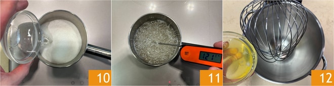 Consacrez-vous maintenant à la préparation de la meringue à l'italienne. Dans une casserole, versez le sucre et l'eau 10 et portez à une température de 121°C 11. Pendant ce temps, montez les blancs d'œufs en neige dans un batteur avec les fouets 12.