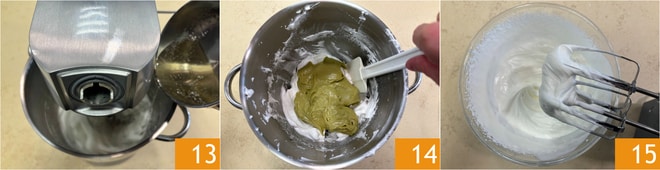 Ajoutez en filet le sirop à 121°C 13 et continuez à monter. Une fois que la meringue est prête, incorporez la crème pâtissière à la pistache et mélangez en mouvements de bas en haut 14. À part, montez semi-fermes les 300 g de crème fraîche 15.