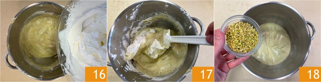 Incorporez-la à la meringue 16 et mélangez en mouvements de bas en haut 17 pour ne pas démonter le mélange. Ajoutez les éclats de pistaches 18, mélangez une dernière fois et réservez.