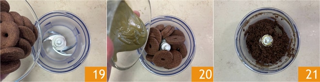 Préparez maintenant la base. Dans un mixeur, mettez les biscuits 19, ajoutez la crème de pistache 20 et mixez jusqu'à obtenir un mélange homogène et de consistance sableuse 21.