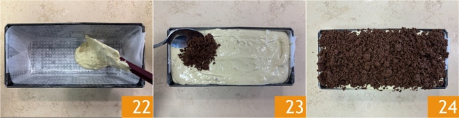 Versez le mélange à la meringue dans un moule rectangulaire de 26x9 cm, beurré et tapissé de papier cuisson 22. Recouvrez la surface avec les biscuits émiettés 23 24 et laissez reposer au réfrigérateur pendant 6 heures.