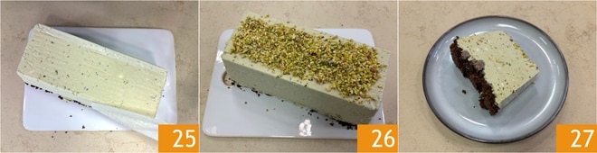 Démoulez et retirez le papier cuisson 25. Saupoudrez la surface d'éclats de pistache 26. Votre semifreddo à la pistache est prêt à être servi 27.