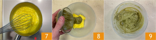 Mélangez à nouveau et transférez le mélange dans la casserole. Faites épaissir la crème pâtissière à feu doux en remuant continuellement 7. Versez la crème dans un bol et ajoutez la crème de pistache 8, mélangez jusqu'à obtenir un mélange homogène 9. Couvrez avec un film plastique et réservez.