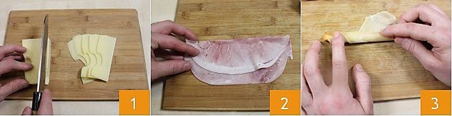 Pour préparer les torsades au four avec jambon et Emmental, commencez par couper 12 fines tranches d'Emmental 1, puis placez une tranche de jambon cuit sur une planche à découper et divisez-la en deux dans le sens de la largeur 2. Ensuite, prenez une torsade à la tomate et disposez autour la tranche d'Emmental 3, au centre de la torsade à la tomate, en laissant les deux extrémités libres.