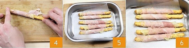 Enroulez de la même manière la tranche de jambon cuit 4. Disposez les torsades ainsi garnies dans un plat à gratin recouvert d'une feuille de papier sulfurisé 5. Enfournez à 190° dans un four statique déjà chaud (160° en four ventilé) pendant cinq minutes, jusqu'à ce que le fromage fonde 6.