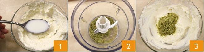 Pour réaliser les gressins aux olives enroulés dans la mortadelle et la robiola, commencez par préparer la crème : mettez la robiola dans un bol, ajoutez une cuillère de lait et mélangez jusqu'à obtenir une consistance dense 1. Hachez les pistaches écalées dans un mixeur 2 et incorporez-les à la crème de robiola 3.