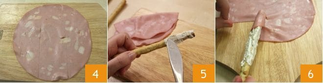À ce stade, étalez les tranches de mortadelle et découpez 3 bandes dans chaque tranche 4. Vous pouvez maintenant composer les amuse-bouches : prenez les gressins aux olives, tartinez-les avec la crème de robiola (en laissant libres quelques centimètres à l'une des extrémités pour pouvoir les prendre) 5 et enroulez-les avec une bande de mortadelle 6 : les gressins aux olives enroulés dans la mortadelle et la robiola sont prêts à être consommés.
