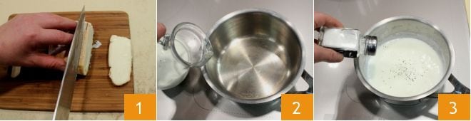 Pour préparer les sfilati avec fondue au poivre noir, commencez par la fondue : coupez le taleggio en tranches 1 puis en dés grossiers. Ensuite, dans une grande casserole, versez le lait 2, puis salez 3 et poivrez à votre goût.