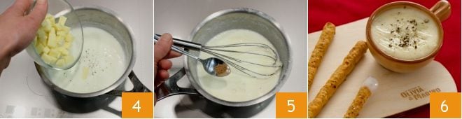 Faites chauffer le lait, puis ajoutez le taleggio en dés 4 et faites cuire à feu doux en remuant avec un fouet jusqu'à obtenir une crème. Peu avant d'éteindre le feu, ajoutez un peu de noix de muscade 5. Transférez ensuite votre fondue au poivre noir dans de petits verres ou des récipients en terre cuite et servez avec les sfilati 6 !