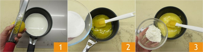 Pour réaliser les sfogliatelles faciles, commencez par préparer la crème pâtissière : chauffez dans une casserole le lait aromatisé avec le zeste de citron 1. Dans une autre casserole, versez le sucre et les jaunes d'œufs 2. Mélangez avec une spatule et ajoutez la farine tamisée 3. Mélangez en faisant attention à ne pas incorporer d'air.