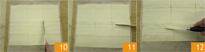 Coupez la pâte feuilletée en 3 parties égales, d'abord dans le sens vertical 10, puis horizontalement 11 pour obtenir 6 rectangles de 10x11,5 cm (environ). Avec un couteau bien aiguisé (ou une roulette à pâtisserie), réalisez des petites bandes d'environ 4 mm d'épaisseur sur la moitié du rectangle : laissez également 1 cm du bord pour ne pas couper entièrement 12 et maintenir les bandes attachées entre elles.
