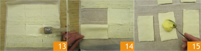 Badigeonnez la surface de la pâte avec la moitié du beurre fondu 13 et repliez les rectangles sur eux-mêmes, avec la partie sans coupe qui vient fermer celle avec les coupes 14. Déposez une cuillère à café de crème pâtissière au centre du rectangle plié 15.