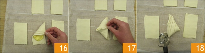 Ramenez un coin vers le centre du rectangle 16 et pressez la pâte pour bien la faire adhérer 16. Ramenez l'autre coin vers le centre en formant un triangle 17. Avec les doigts, appuyez légèrement pour unir les deux bords de pâte afin de maintenir la forme pendant la cuisson. Appuyez bien avec le bout des doigts aussi sur le côté long. Retournez la sfogliatella du côté de la décoration et, si nécessaire, finissez avec une roulette 18.