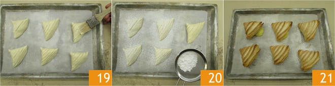 Disposez les sfogliatelles sur une plaque recouverte de papier sulfurisé avec la partie de fermeture vers le bas, badigeonnez avec le reste du beurre fondu la surface 19 et saupoudrez de sucre glace 20. Faites cuire dans un four statique préchauffé à 200°C pendant environ 15 minutes, ou jusqu'à ce qu'elles soient dorées. Retirez du four et laissez refroidir 21 avant de saupoudrer de nouveau de sucre glace.