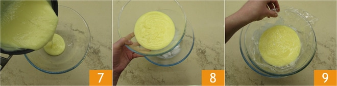 Versez la crème dans un bol 7 et placez-le dans un autre bol avec de la glace, pour accélérer le processus de refroidissement sans que la crème perde de sa brillance et consistance 8. Couvrez avec un film plastique au contact et laissez refroidir 9.