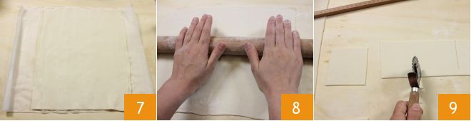 En attendant, prenez la pâte feuilletée déjà prête 7 et transférez-la sur une planche farinée, puis étalez-la légèrement avec un rouleau à pâtisserie 8. Ensuite, découpez des carrés de 8x8 cm avec un emporte-pièce 9.