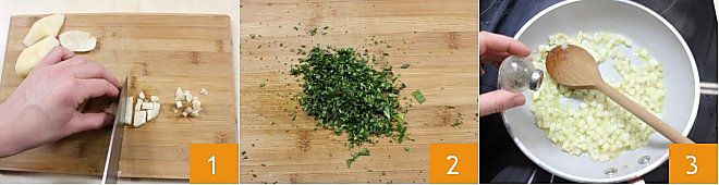 Pour préparer les feuilletés aux topinambours trifolati, commencez par éplucher et nettoyer le topinambour, puis coupez-le en tranches et ensuite en dés réguliers 1. Hachez très finement les herbes aromatiques et réservez-les 2. Mettez un filet d'huile dans une poêle et ajoutez le topinambour coupé en dés. Faites-le cuire pendant quelques minutes, salez et poivrez à votre goût 3;