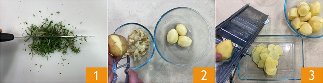 Pour préparer le gratin de pommes de terre, commencez par hacher finement le romarin 1 et mettez-le de côté. Ensuite, épluchez les pommes de terre 2 et à l'aide d'une mandoline, coupez-les en tranches d'environ 3 mm d'épaisseur 3.