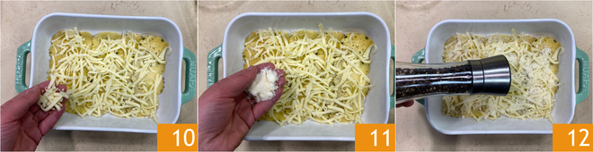 Couvrez la surface avec la provola râpée 10, ajoutez ensuite le fromage râpé 11 et une pincée de poivre 12. Continuez ainsi jusqu'à épuisement des ingrédients, vous devriez obtenir 6 couches de pommes de terre à la fin.