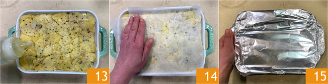Assaisonnez la dernière couche avec de l'huile 13, couvrez d'abord avec une feuille de papier sulfurisé 14 puis avec une feuille d'aluminium 15. Faites cuire au four statique à 220°C pendant 70 minutes.