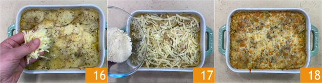 Après ce temps, vérifiez si les pommes de terre sont cuites, puis ajoutez sur la surface du gratin la provola 16 et le Parmesan 17. Terminez la cuisson à la même température en mode grill pendant 5-8 minutes. Le gratin de pommes de terre est prêt à être servi 18.