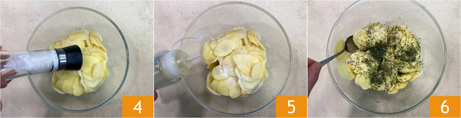 Assaisonnez-les ensuite avec du sel 4, du poivre, de l'huile 5 et le romarin haché. Mélangez bien 6 pour que l'assaisonnement soit réparti sur toutes les tranches 6.