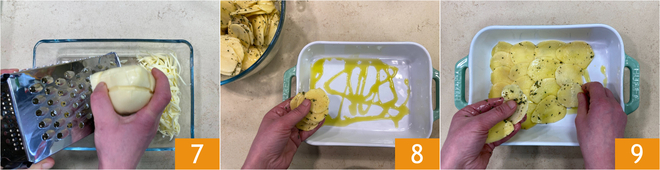 Avec une râpe à gros trous, râpez la provola 7 et mettez de côté. Au fond d'un plat de 25x10,5 cm, versez un filet d'huile et disposez les tranches de pommes de terre pour former une première couche 8 9.