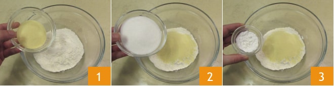 Pour réaliser le sfouf, versez dans un grand bol la farine, la semoule 1, le sucre 2 et la levure 3.