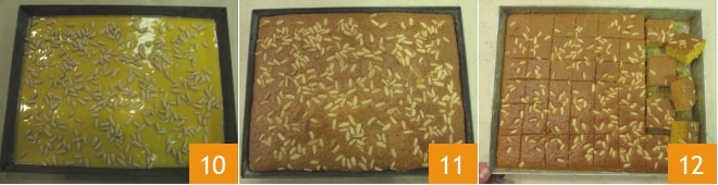 Faites cuire dans un four statique préchauffé à 180° pendant environ 35 minutes 10. Une fois cuit, sortez le gâteau et laissez tiédir 11. Servez le sfouf découpé en carrés ou en losanges d'environ 4 cm 12 !