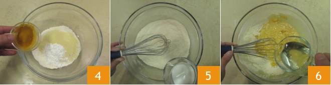 Ajoutez le curcuma 4 et mélangez les poudres avec un fouet manuel. Tout en continuant à mélanger, ajoutez également le lait 5 et l'huile végétale 6.
