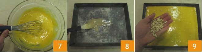 Vous devez obtenir un mélange lisse et homogène 7. Maintenant, prenez un moule rectangulaire à bords hauts de dimensions 38x25 cm et badigeonnez le fond et les bords avec le tahini 8. Versez le mélange à l'intérieur et parsemez la surface de pignons de pin 9.