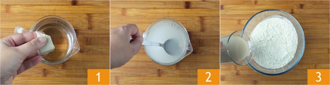 Pour préparer les sgabei, commencez par mettre la levure dans un récipient 1, ajoutez l'eau tiède et dissolvez-la 2. Dans un bol, mettez la farine et versez toute l'eau 3.