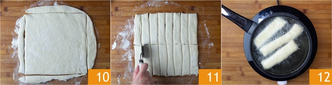 Avec un emporte-pièce, redéfinissez les bords 10, puis divisez le rectangle en bandes de 15 cm de long et 2-3 cm de large 11. Vous obtiendrez environ 16 pièces. Couvrez d'un torchon propre et laissez lever pendant 1 heure dans un endroit sec et sans courants d'air. Chauffez l'huile d'arachide à une température de 170-175°C et faites frire 2-3 sgabei à la fois 12, pour ne pas trop abaisser la température de l'huile.