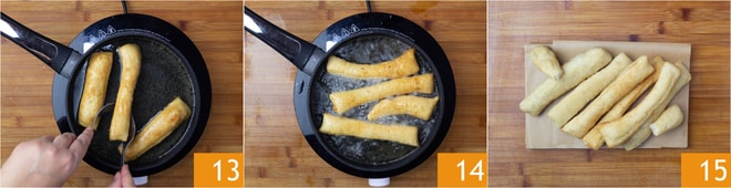 Faites cuire pendant 2 minutes de chaque côté 13. Une fois qu'ils sont bien dorés 14, disposez-les sur du papier absorbant pour éliminer l'excès d'huile. Assaisonnez-les avec un peu de sel et vos sgabei sont prêts à être servis 15.
