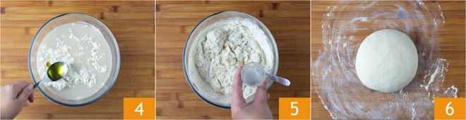 Ajoutez l'huile 4 et commencez à pétrir avec une cuillère. Ajoutez le sel 5, puis transférez-vous sur un plan de travail et pétrissez jusqu'à obtenir une pâte lisse et homogène 6.