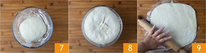 Transférez-la dans un bol fariné 7 et laissez lever, couvert d'un film plastique, dans un endroit sec et sans courants d'air pendant 3 heures ou jusqu'à ce qu'elle double de volume 8. Reprenez la pâte et étalez-la avec un rouleau à pâtisserie pour créer une feuille de 1 cm d'épaisseur 9.