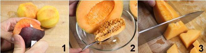 Pour préparer le smoothie au yaourt, commencez par laver les pêches (il vous en faudra environ 3), épluchez-les et retirez le noyau, puis coupez-les grossièrement et mettez-les de côté 1. Ensuite, occupez-vous du melon : coupez-le en deux, retirez les graines 2 et l'écorce, puis coupez-le en morceaux 3.