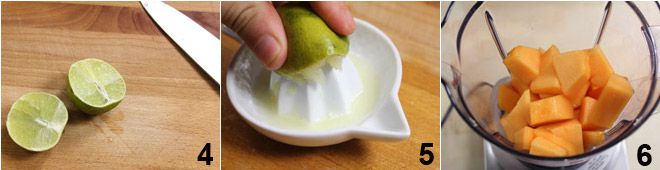 Coupez le citron vert en deux 4 et pressez-le à l'aide d'un presse-agrumes 5. Recueillez le jus obtenu dans un verre et réservez-le. Prenez maintenant un blender et mettez le melon 6