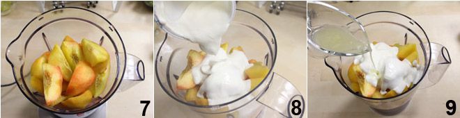 et les pêches 7. Versez le yaourt 8 et le jus de citron vert 9, fermez le blender et activez-le. Continuez à mixer jusqu'à obtenir un mélange crémeux. Voici votre smoothie au yaourt, bien frais !