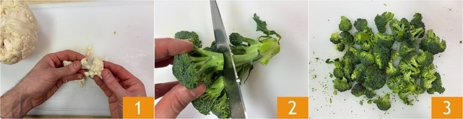 Pour préparer la sole en papillote avec légumes à la vapeur, commencez par les légumes. Séparez les fleurons de chou-fleur et coupez les plus grands en deux 1. Faites de même avec les brocolis 2 3.