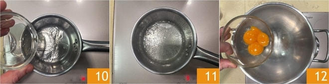 Occupez-vous de la sauce hollandaise. Dans une petite casserole, versez le vinaigre 10 et une cuillère d'eau. Portez sur le feu et faites cuire jusqu'à ce que le mélange ait réduit de moitié ; cela prendra quelques minutes 11. Pendant ce temps, faites fondre le beurre clarifié. À ce stade, versez les jaunes d'œufs dans un cul-de-poule au bain-marie 12.