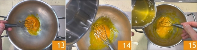 Commencez à les battre avec un fouet 13, puis ajoutez le mélange de vinaigre réduit 14. Continuez à battre jusqu'à ce que le mélange ait épaissi (il doit atteindre environ 65°), puis versez le beurre clarifié fondu en filet en continuant de battre 15. Mélangez jusqu'à obtenir une sauce crémeuse.