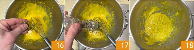 Hors du feu, assaisonnez avec l'estragon haché 16, une pincée de sel et de poivre 17. Votre sauce hollandaise est prête 18.