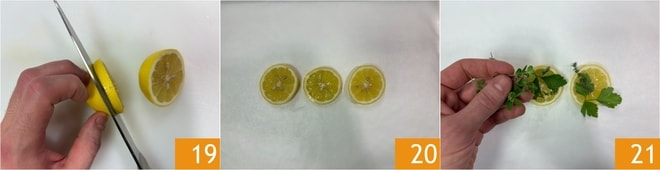 Passez maintenant à la cuisson du poisson. Coupez les citrons en tranches 19, puis disposez 3 tranches sur une feuille de papier sulfurisé 20 et placez les herbes aromatiques dessus 21.