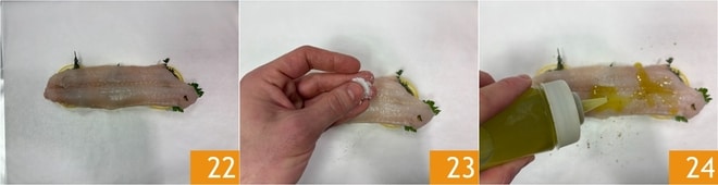 Déposez un filet de poisson par-dessus 22 et assaisonnez avec du sel 23, du poivre et de l'huile 24.