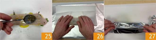 Ajoutez une poignée de câpres 25. Refermez maintenant le filet de sole d'abord dans le papier sulfurisé 26 puis dans le papier d'aluminium 27 pour bien le sceller et former une papillote.