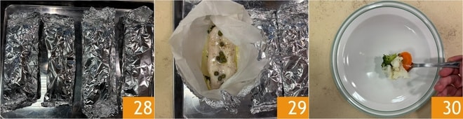 Procédez de la même manière pour les 4 filets, en les disposant au fur et à mesure sur une plaque 28. Faites cuire dans un four statique préchauffé à 180° pendant 15-20 minutes. Le temps de cuisson peut varier selon la taille des filets. Sortez la sole en papillote du four et ouvrez-les délicatement 29, puis dressez. Disposez les légumes au fond de l'assiette (vous pouvez les réchauffer quelques minutes au bain-marie) 30.