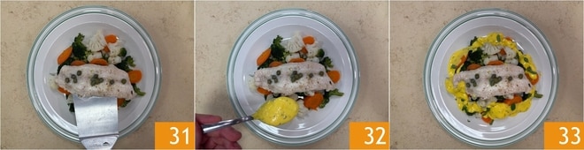 Déposez le poisson par-dessus 31 et garnissez avec la sauce hollandaise à l'estragon 32. Votre sole en papillote avec légumes à la vapeur est prête à être servie 33 !