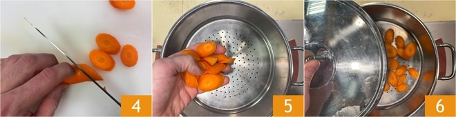 Passez aux carottes : épluchez-les et coupez-les en tranches en biais 4. Faites chauffer de l'eau dans un cuiseur vapeur et ajoutez une pincée de sel. Placez le panier vapeur dessus. Dès que l'eau bout, disposez les carottes à l'intérieur du panier 5. Couvrez avec un couvercle 6 et faites cuire pendant 5 minutes.