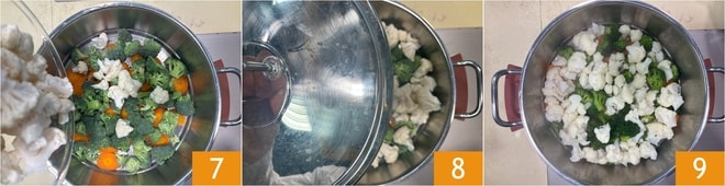 Après ce temps, ajoutez les brocolis et le chou-fleur 7, recouvrez de nouveau avec le couvercle 8 et laissez cuire encore 10 minutes. Les légumes doivent être tendres mais encore croquants 9. Assaisonnez de sel.